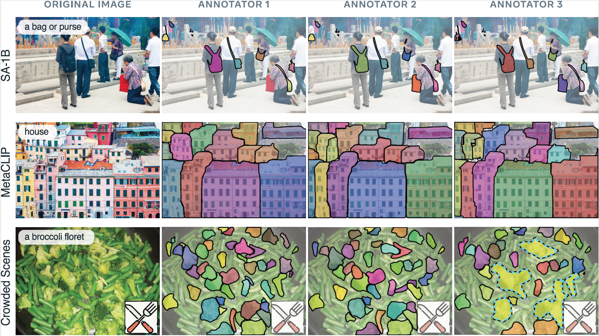 For each subset, the annotations are multi-reviewed by 3 independent human annotators. Each row in the figure shows an image and noun phrase pair from one of the domains, and masks from the 3 annotators. Dashed borders indicate special group masks that cover more than a single instance, used when separating into instances is deemed too difficult. Annotators sometimes disagree on precise mask borders, the number of instances, and whether the phrase exists. Having 3 independent annotations allow us to measure human agreement on the task, which serves as an upper bound for model performance.